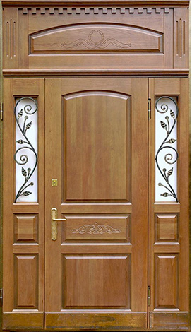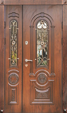 Входная металлическая дверь с порошковым покрытием стеклом и ковкой в частный дом №27