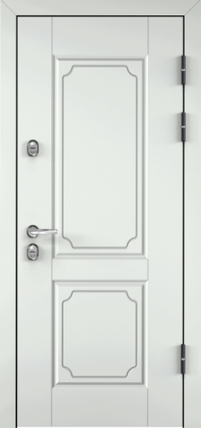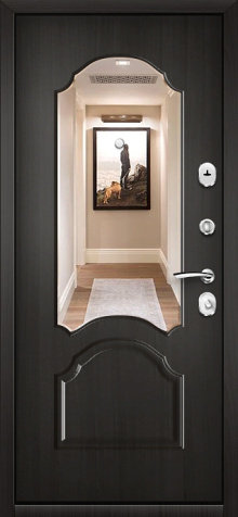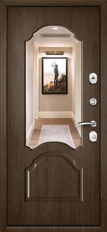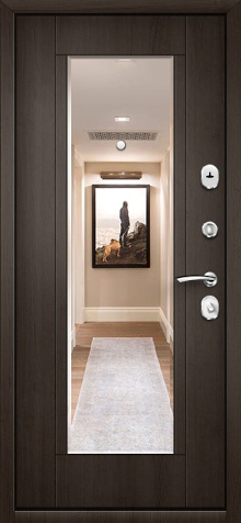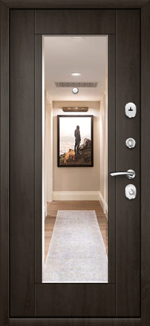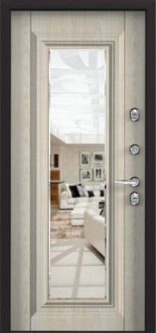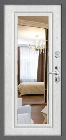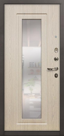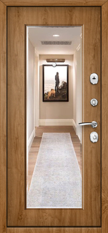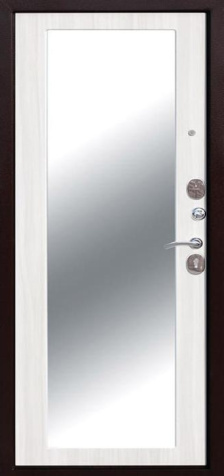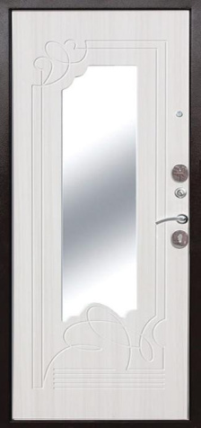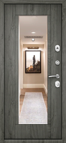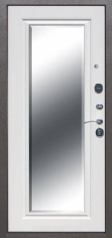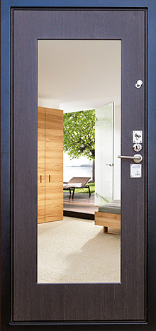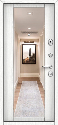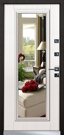 Если входная дверь в квартиру с зеркалом планируется в светлом интерьере, обратите внимание на «белые входная дверь с зеркалом»: светлые фактуры визуально убирают массивность металла, а зеркало «поддерживает» горизонтальные линии мебели и света.